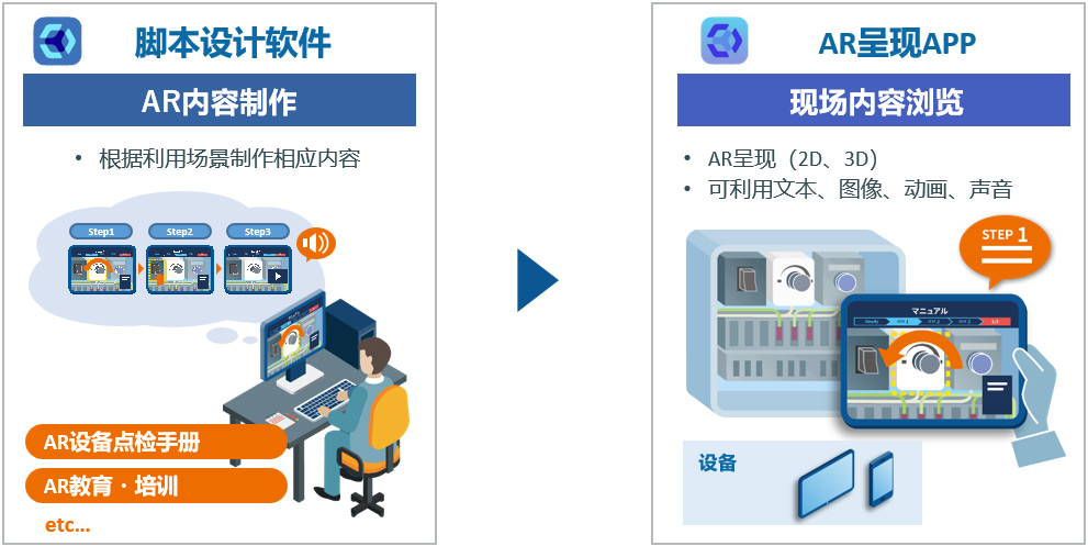 我們的產(chǎn)品由無需編程的腳本設計軟件(Story Designer)和可以在平板設備上播放和觀看內(nèi)容的應用程序(Story Viewer)組成。使用現(xiàn)場業(yè)務數(shù)字化AR軟件,可以防止因錯誤操作設備、維保流程錯漏等導致的工作失誤,建立數(shù)字化作業(yè)履歷,為復雜技術的傳承和提高現(xiàn)場工作效率做出貢獻。