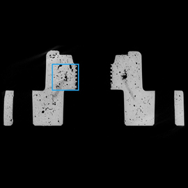 自動檢出的壓鑄件零件的孔隙,以數(shù)百μm為單位按顏色分別顯示體積差別,能通過孔隙的分布狀態(tài)進(jìn)行3維顯示確認(rèn)。