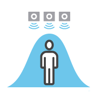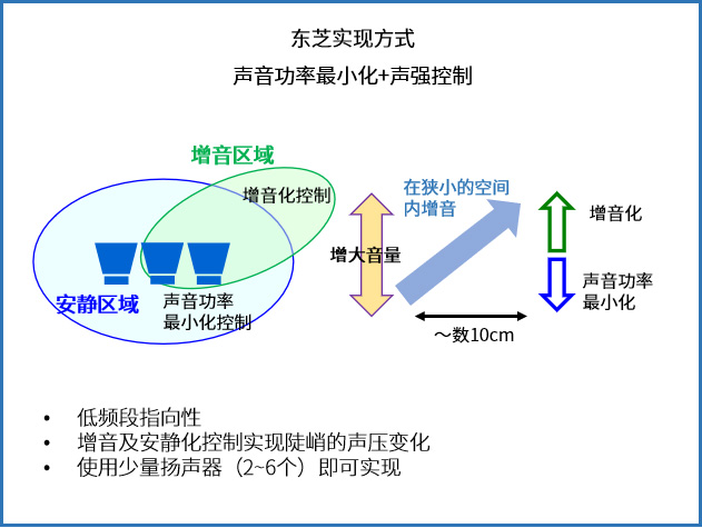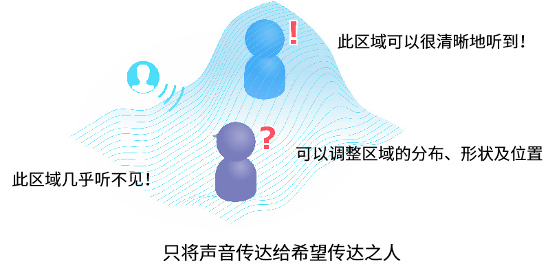 利用音場控制技術(shù),無需特殊硬件,使用三個(gè)揚(yáng)聲器,利用空間聲壓分布可創(chuàng)建聲音輸出清晰的區(qū)域和難以聽到的區(qū)域。
