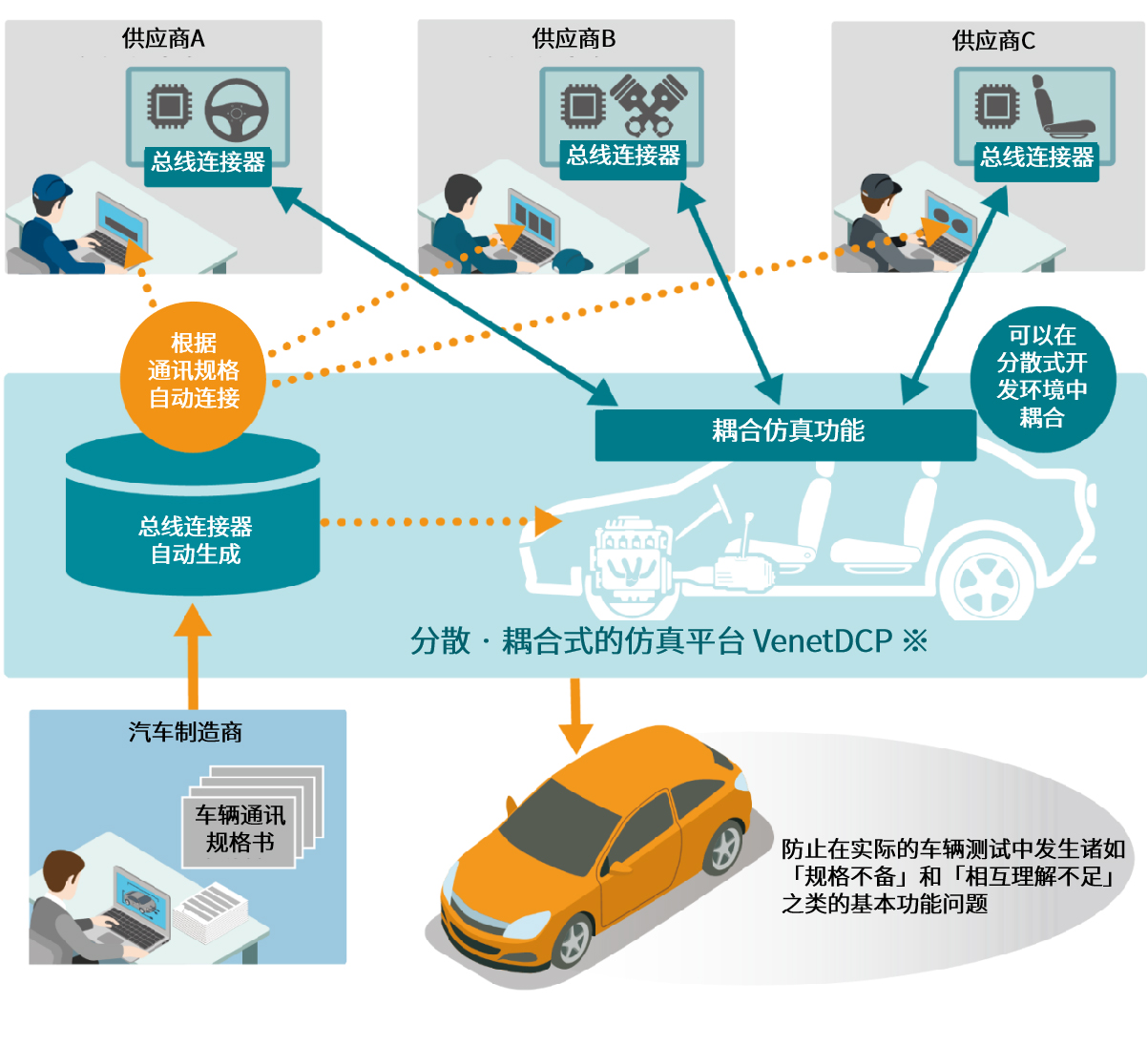 為了更廣泛適用于已在汽車制造商及供應(yīng)商中普及推廣的基于模型的開發(fā)方式,VenetDCP將大部分模型、不同開發(fā)工具、不同企業(yè)聯(lián)系在一起,提供可以基于網(wǎng)絡(luò)平臺的協(xié)同驗證環(huán)境。這樣一來,使用者便可以提前實施諸如自動駕駛以及ADAS這種需要協(xié)同多個子系統(tǒng),且車載環(huán)境驗證極為復(fù)雜的項目,實現(xiàn)品質(zhì)改善,大幅度提高生產(chǎn)效率。