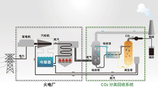 針對發(fā)電產(chǎn)生廢氣中的CO2,通過吸收塔中的吸收液進行吸收,然后在再生塔中對該吸收液進行加熱使其釋放出CO2。已釋放完CO2的吸收液會重新回到吸收塔,通過這樣的循環(huán)對所產(chǎn)生廢氣中的CO2可實現(xiàn)連續(xù)地分離和回收。