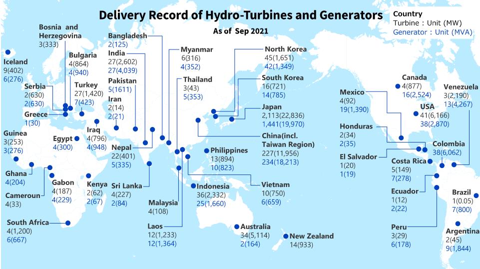 東芝在日本、中國、東南亞乃至非洲及中南美洲共40多個國家和地區(qū)累計交付2300多臺水輪機和1800多臺發(fā)電機,設備容量分別超過62,000MW和75,000MVA。東芝擁有超過一個世紀的豐富經(jīng)驗與傲人業(yè)績。