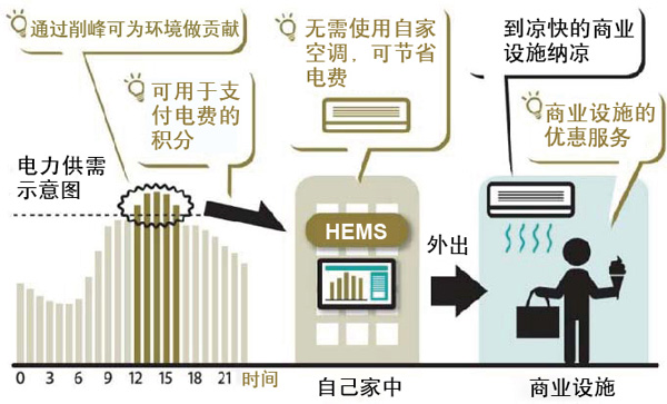東芝開發(fā)的“HEMS”可以掌握電力需求高峰時(shí)期,通過(guò)提前向住戶提示用電高峰時(shí)商業(yè)設(shè)施的優(yōu)惠服務(wù)信息,促使居民外出實(shí)現(xiàn)個(gè)人住宅的節(jié)能,同時(shí),還根據(jù)居民在高峰時(shí)間的節(jié)電量獎(jiǎng)勵(lì)相應(yīng)的積分,積分可以用于支付電費(fèi)。通過(guò)提供多種優(yōu)惠和獎(jiǎng)勵(lì),實(shí)現(xiàn)高峰用電分流。