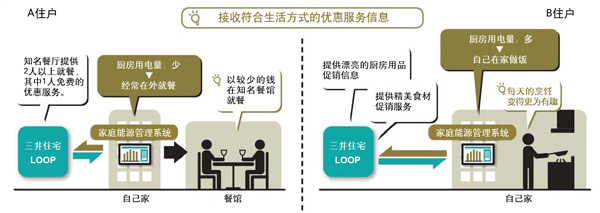 東芝開發(fā)的“HEMS”以各居民住戶的用電信息為基礎(chǔ),對(duì)居民的生活方式進(jìn)行分析。并從 “三井住宅LOOP” 注2合作的餐廳、家電量販店、家務(wù)代理等眾多企業(yè)提供的優(yōu)惠服務(wù)信息中,選擇符合各居民生活方式和潛在需求的服務(wù),并在適當(dāng)?shù)臅r(shí)候顯示在HEMS的畫面上。