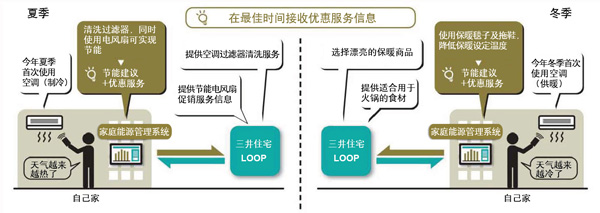 以空調(diào)的用電量信息為基礎(chǔ),分析居民住戶對(duì)氣候冷熱的體感變化和開始使用冷暖氣的時(shí)間,在提供環(huán)保節(jié)能建議的同時(shí)發(fā)送空調(diào)過(guò)濾器清洗優(yōu)惠、應(yīng)季家電、飾品的優(yōu)惠等服務(wù)信息。由此,居民可以在適當(dāng)?shù)臅r(shí)候收到符合自己生活方式的節(jié)能建議和優(yōu)惠服務(wù)信息,在促進(jìn)居民采取節(jié)能措施的同時(shí),居民也可以享受到符合個(gè)人需求的服務(wù)。