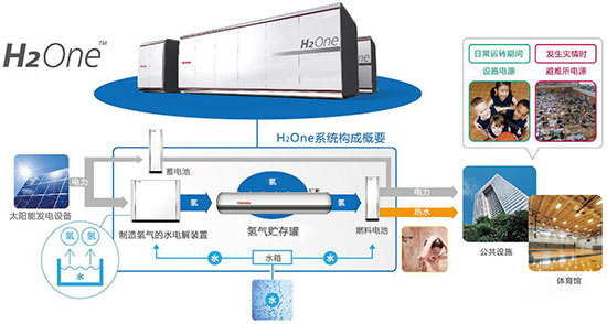 “H2One” 是一個由太陽能發(fā)電設備、蓄電池、電解水制氫裝置、儲氫罐、燃料電池等組合而成的自給型能源供應系統(tǒng),利用太陽能發(fā)電設備產生的電能將水電解,制成氫氣儲存于儲氫罐中作為燃料電池的燃料,并通過燃料電池提供電力和熱水。因“H2One”系統(tǒng)只需要陽光和水即能運轉,在發(fā)生災害甚至是生命線被切斷的時刻,該系統(tǒng)也可獨立提供電力和熱水。川崎MARIEN作為指定的周邊居民災害臨時避難所,一旦發(fā)生災害,其所儲存的氫氣可為300人提供約1周左右的電力和熱水。另外,由于“H2One”系統(tǒng)采用了集裝箱式外形,必要時可以用拖車將該系統(tǒng)運往受災地區(qū)。