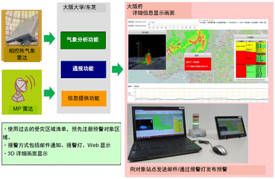在本次實(shí)證實(shí)驗(yàn)中,研究人員將使用能夠在30秒內(nèi)對(duì)導(dǎo)致突發(fā)性暴雨的積雨云形成過(guò)程進(jìn)行立體觀測(cè)的相控陣氣象雷達(dá)和能夠精確觀測(cè)降雨量的MP雷達(dá)(注2),通過(guò)對(duì)二者數(shù)據(jù)的分析,提前預(yù)警突發(fā)性暴雨。并將結(jié)果以電子郵件的形式報(bào)告到大阪府防汛部門以及在各相關(guān)站點(diǎn)設(shè)置的系統(tǒng),并通過(guò)報(bào)警燈發(fā)出預(yù)警。本系統(tǒng)將在大阪府內(nèi)的10個(gè)站點(diǎn)運(yùn)行,以驗(yàn)證預(yù)防洪澇災(zāi)害的有效性。