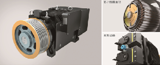 小型化的永磁同步電動機、更節(jié)省空間;用電量減少30%以上(與傳統(tǒng)電動機相比);無齒輪曳引式,無需齒輪油,實現(xiàn)低振動低噪音,更為綠色環(huán)保;馬達采用集中卷線方式、體積更為小巧,具有高科技的領先水平。