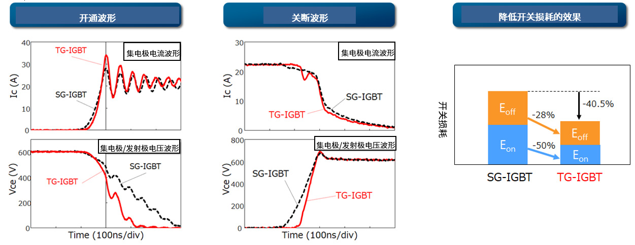 通過(guò)三柵極IGBT與柵極控制技術(shù)的結(jié)合,與傳統(tǒng)IGBT相比,成功實(shí)現(xiàn)了開(kāi)通損耗和關(guān)斷損耗分別降低50%和28%,整體開(kāi)關(guān)損耗最多可降低40.5%。對(duì)于性能改善趨于極限的硅IGBT而言,該技術(shù)可顯著降低其功率損耗,從而為降低功率轉(zhuǎn)換器的功率損耗做出巨大貢獻(xiàn)。
