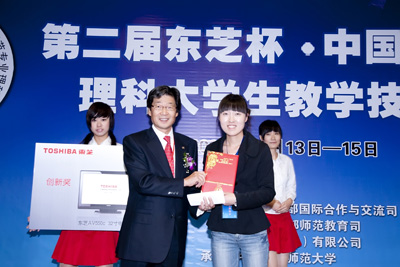 本次教學(xué)技能大賽分預(yù)賽和決賽兩個階段進行,參賽學(xué)生首先在各自所在的院校通過預(yù)賽選出決賽選手。決賽內(nèi)容包括教案評比、模擬授課、即席講演三個部分,由教育部及各院校專家組成評選委員會進行專業(yè)評選。即席講演部分采用了現(xiàn)場抽題的方式,極大地考驗了參賽同學(xué)的臨場應(yīng)變能力與思維邏輯能力。此外,數(shù)學(xué)、物理、化學(xué)三個專業(yè)共計9名獲獎大學(xué)生還將獲得東芝提供的獎品以及赴日本研修的機會。