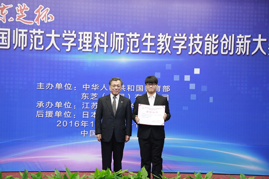 本屆大賽決賽,更是前所未有的吸引了來(lái)自全國(guó)45所師范大學(xué)133名選手的參加,經(jīng)過(guò)教案設(shè)計(jì)、即席演講、模擬授課和現(xiàn)場(chǎng)提問(wèn)四個(gè)環(huán)節(jié)的激烈角逐,數(shù)學(xué)、物理和化學(xué)學(xué)科一等獎(jiǎng)分別由來(lái)自江蘇師范大學(xué)沈敏、江蘇師范大學(xué)潘天文以及長(zhǎng)春師范大學(xué)朱晨獲得,憑借獨(dú)具創(chuàng)意的教案以及對(duì)教學(xué)工作的創(chuàng)新思考,來(lái)自天津師范大學(xué)的呂天璽同學(xué)獲得本屆東芝創(chuàng)新獎(jiǎng)。據(jù)悉,獲獎(jiǎng)?wù)叱A得教育部頒發(fā)的榮譽(yù)證書(shū)和東芝公司提供的產(chǎn)品外,還將赴日本進(jìn)行研修和訪問(wèn)。