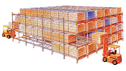 ·現(xiàn)設(shè)有36個(gè)品種,每個(gè)品種6個(gè),庫存量216個(gè)貨位。上邊為一般巷道式貨架堆放形式,下邊為重力式貨架堆放形式。